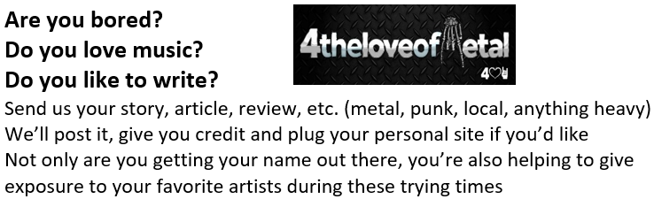 Do you have a story that you’d like to share with the world, but don’t feel like messing around with your own time-consuming website? Are you an up-and-coming author that wants to build your portfolio and get your name out there. Let us do the dirty work for you. Send us your story, along with any relevant pictures. We’ll format it and post it to 4theloveofmetal.com. We’ll even post it to our 4theloveofmetal Facebook Group Page.
